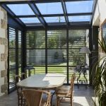 Totalement personnalisable, la double extension Technal se pare aussi d’éclairages LED. Ils sont intégrés discrètement au niveau des traverses horizontales pour un effet presque invisible. A la nuit tombée, ils animent la façade et créent des jeux de lumière qui se reflètent dans la piscine. La journée, un volet roulant régule également la lumière et l’occultation totale du toit de verre. Les larges possibilités d’ouvertures des baies coulissantes permettent de laisser l’air frais circuler librement. Et l’hiver, les apports solaires réchauffent la pièce, réduisant les besoins en chauffage.