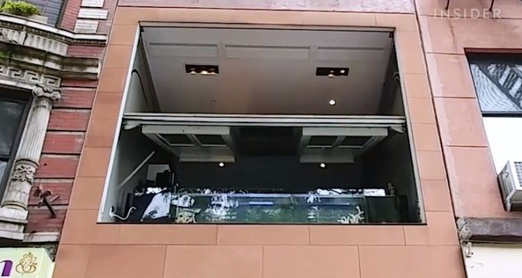 Plus impressionnant, le triplex de 185 m² dispose d’un mur escamotable capable de totalement disparaître pour se transformer en balcon. Le mur est équipé d’un système basculant offrant une vue impressionnante sur les rue de la ville, avec un gigantesque aquarium faisant office de garde-corps.