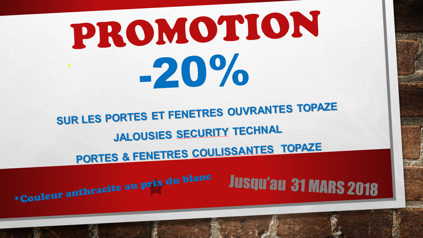 Profitez d'une promotion de -20% sur les portes et les fenêtres ouvrantes Topaze chez Samir Industrie en Martinique. Jalousies Security Technal Portes et Fenêtres coulissantes Topaze Offre valabes jusqu'au 31 mars 2018 *Couleur anthracité au prix du blanc.