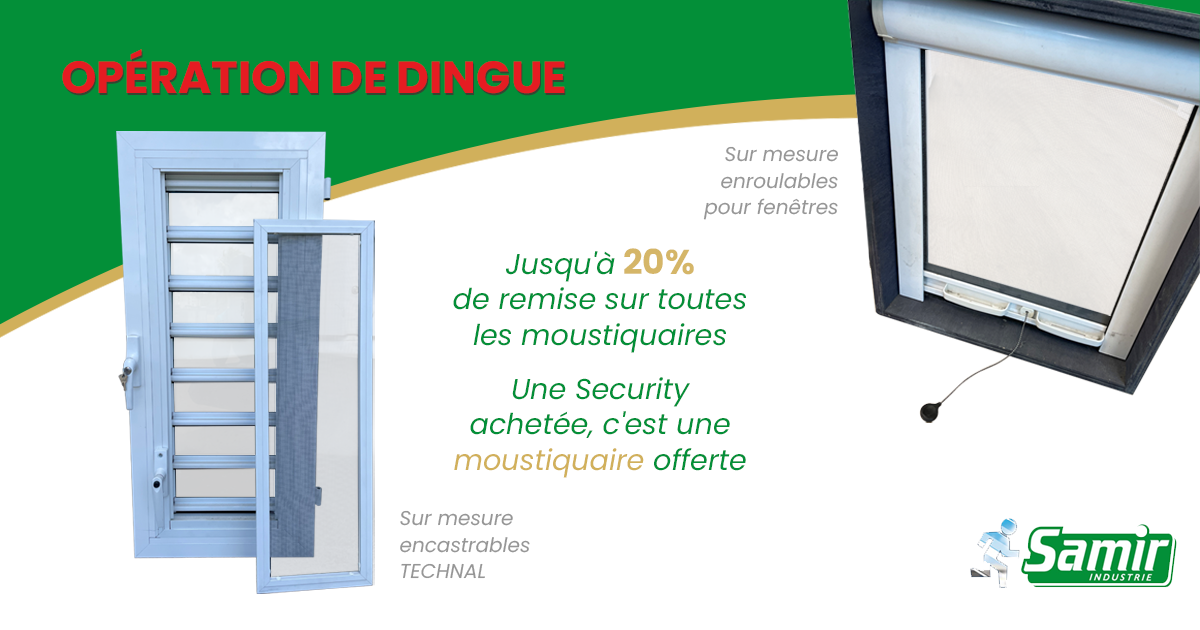 ! Opération de DINGUE ! -10% à -100% sur vos moustiquaires pour fenêtres ! 10% de réduction sur toutes les moustiquaires de SAMIR 20% sur toutes les moustiquaires dès 5 unités achetées. ... et pour tout achat d'une Jalousie Security, la moustiquaire adaptée est OFFERTE.