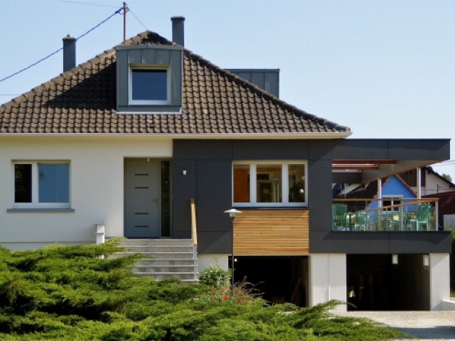 "L'idée consistait à rénover la maison, aménager les combles et créer un lien évident entre le jardin et la maison, par le biais d'une extension et d'un escalier", explique Patrick Fintz, d'Atelier Rhénan d'Architecture. Résultat, le séjour a été ouvert avec de grandes portes fenêtres donnant directement sur une extension avec une terrasse bois flambant neuve, qui dépoussière la bâtisse.