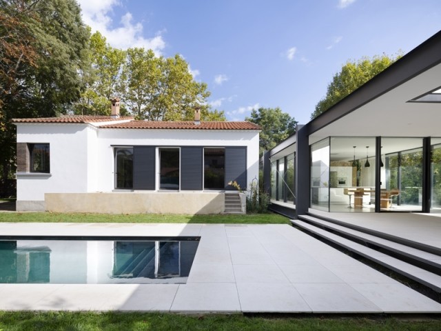 Trop petite pour accueillir confortablement ses nouveaux occupants, cette maison a presque doublé sa surface grâce à une extension. Tout en verre, cette dernière offre un franc contraste avec la bâtisse et permet, en plus, d'inviter le jardin à l'intérieur.